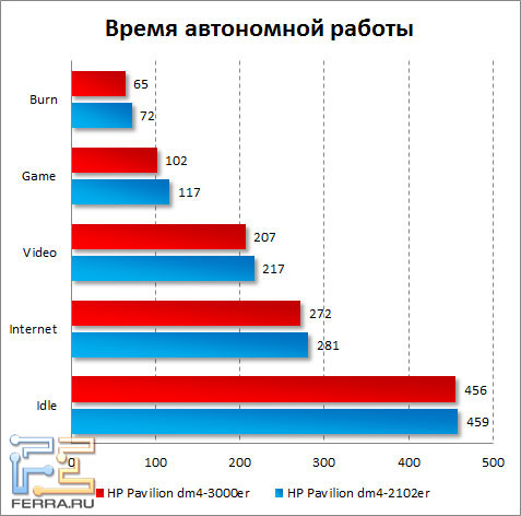 Результаты тестирования автономности почти бессмысленно комментировать - они почти идентичны для обоих лэптопов. Pavilion dm4-3000er лишь слегка отстал (на 3-15 минут в различных тестах), что совершенно несущественно. Видимо, на его слегка худших показателях сказалась более высокая частота процессора и чуть более быстрая видеокарта. Но вообще автономность обоих компьютеров внушает уважение - они способны продержаться на одном заряде до 8 часов. Хотя, конечно, при работе в Интернете это значение падает до 4,5 часов, а просмотр видео снижает показатель до 3,5 часов. Но и это тоже неплохо.