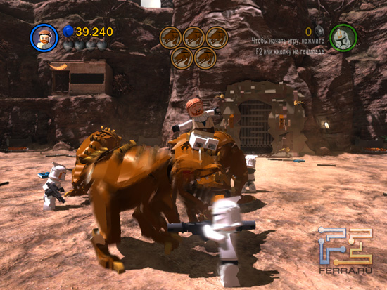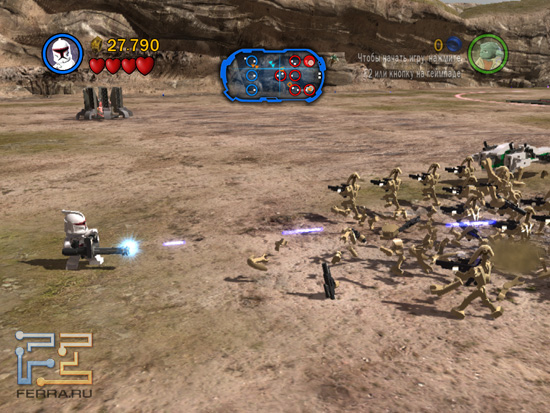 Естественно, просто так никто не будет отгружать вам солдатиков. Роль местной валюты здесь играют маленькие кругляшки Лего, выбивать которые приходится буквально из всего - из врагов, ящиков, растений, панелей космических кораблей, компьютеров, вражеской техники и прочего барахла. Если вашего персонажа убивают на поле боя (а такое случается часто), из него вываливается часть кровно заработанных деталей, так что будьте крайне внимательны, особенно если вы решили пройти игру на 100%. Но об этом немного позже.