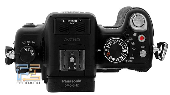 На верхней части GH2 расположены традиционные элементы. Это раньше всего, большущий барабан, отвечающий за смену режима съемки.
