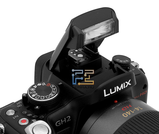 Кроме встроенной вспышки есть и разьем для подключения вспышки внешней. В отличие от GF1 и GF2, он не прикрыт пластиковой заглушкой.
