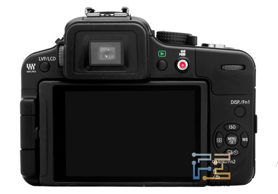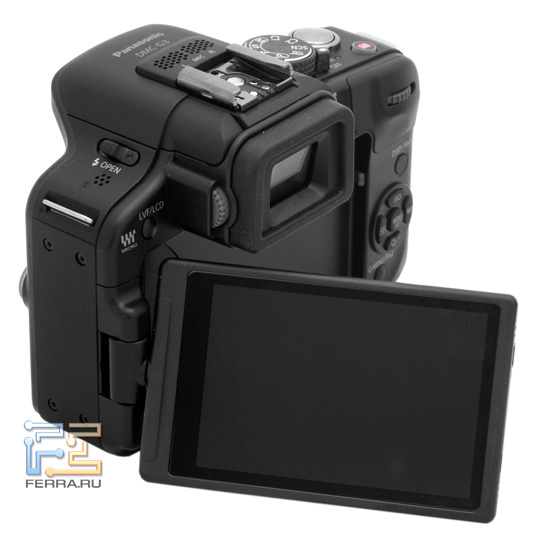 К сожалению, датчика приближения в Lumix G3 нет, поэтому переключаться между экраном и видоискателем придется кнопкой, свернув экран лицом внутрь. В этом случае видоискатель включается автоматически.