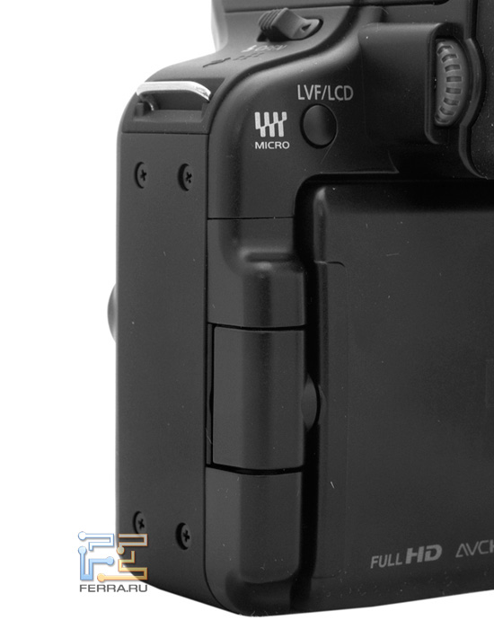 Кольцо байонета камеры окружено прочной металлической вставкой, которая выполняет не только декоративную функцию, но и укрепляет конструкцию. На ручке имеется небольшая вставка из soft touch пластика. А в правом верхнем углу расположена вспомогательная лампа подсветки автофокуса. На правой части корпуса имеется пластиковая шторка, под ней находятся разъемы HDMI и USB, а кроме того разъем для подключения проводного пульта ДУ.