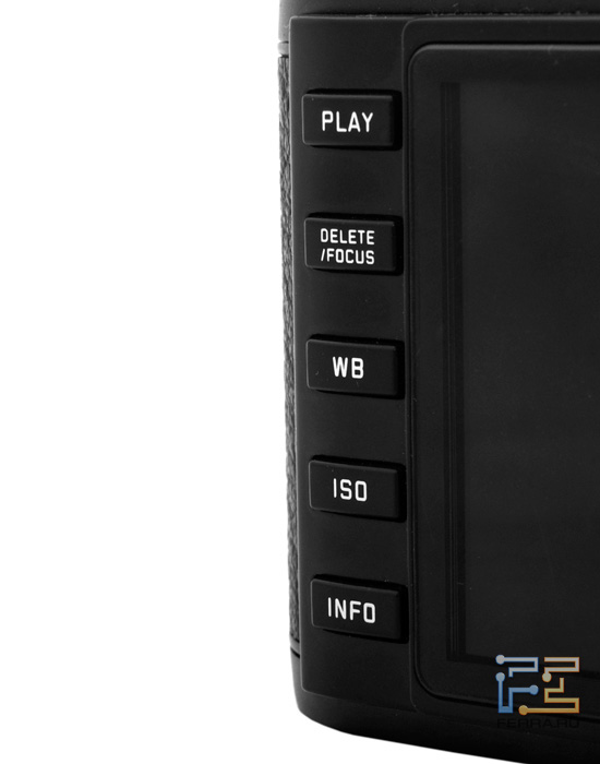 Слева от экрана расположены кнопки перехода в режим просмотра, контроля фокусировки, баланса белого, ISO и режимов отображения информации.