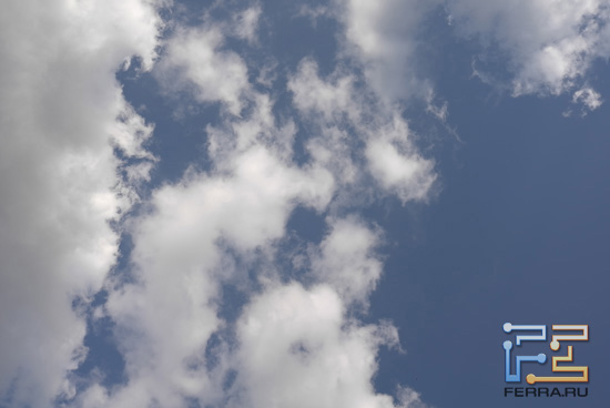 Хороший динамический диапазон, камера успешно справилась с перепадом яркостей. Вернуть детали на светлом доме и немного поднять насыщенность неба можно в Adobe Lightroom, который идет в комплекте.